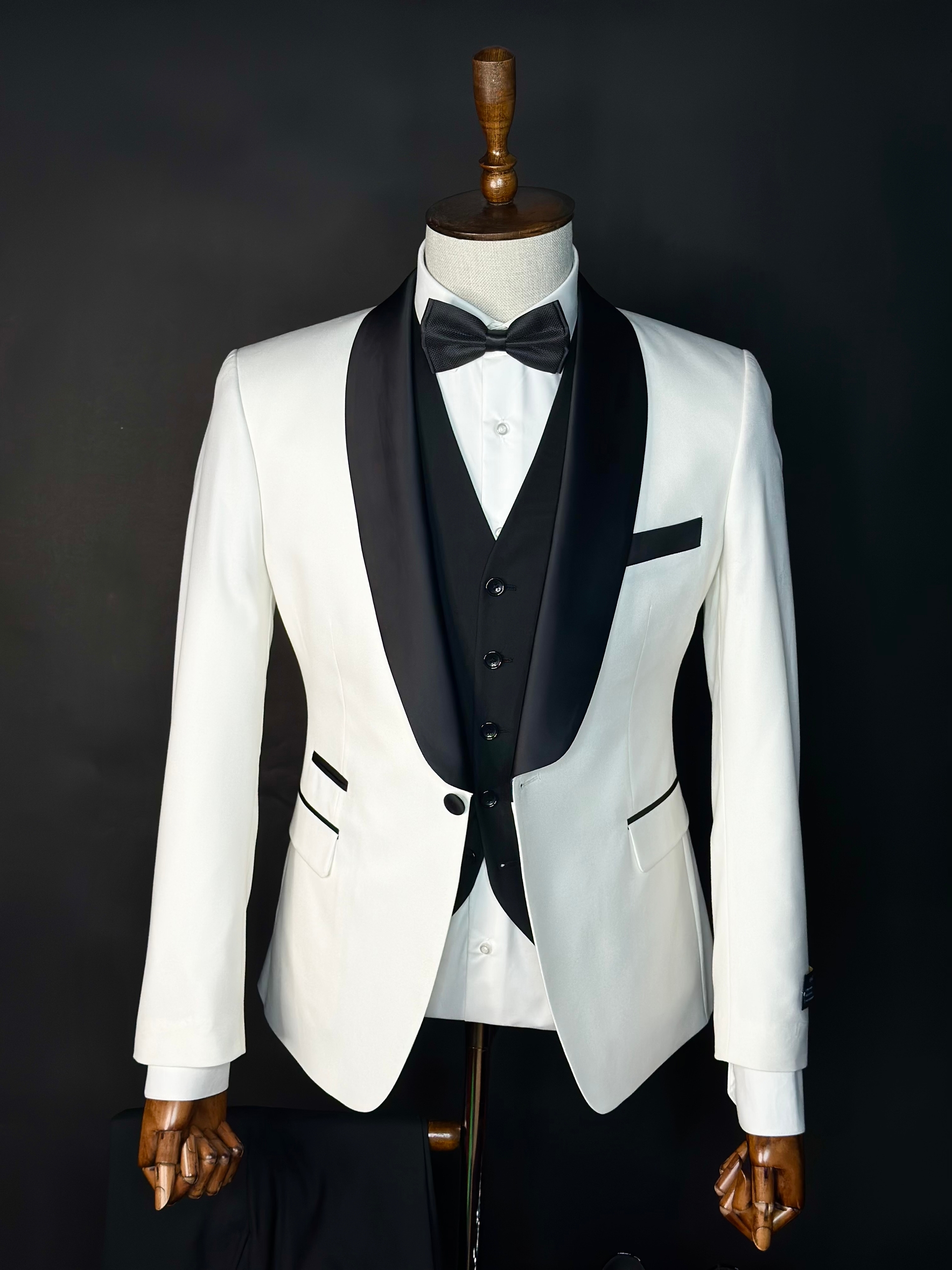 Классический мужской смокинг тройка белого цвета с чёрными жилетом и брюками